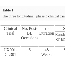 • Note 1. Trials UX001-CL301 (N = 88) and UX023-CL301 (N = 61) were randomized controlled trials, while UX023-CL304 (N = 14) was a single arm trial.
