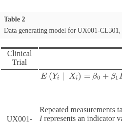 UX001-CL301 $\begin{aligned}{}E\left({Y_{i}}\mid \hspace{2.5pt}{X_{i}}\right)={\beta _{0}}+{\beta _{1}}I\left(\mathrm{G}=1\right)& +{\beta _{2}}I\left(\mathrm{W}=16\right)+{\beta _{3}}I\left(\mathrm{W}=24\right)+{\beta _{4}}I\left(\mathrm{W}=32\right)+{\beta _{5}}I\left(\mathrm{W}=40\right)+{\beta _{6}}I\left(\mathrm{W}=48\right)+{\beta _{7}}I\left(\mathrm{G}=1\right)\times I\left(\mathrm{W}=16\right)\\ {} & +\hspace{2.5pt}{\beta _{8}}I\left(\mathrm{G}=1\right)\times I\left(\mathrm{W}=24\right)+{\beta _{9}}I\left(\mathrm{G}=1\right)\times I\left(\mathrm{W}=32\right)+{\beta _{10}}I\left(\mathrm{G}=1\right)\times I\left(\mathrm{W}=40\right)\\ {} & +{\beta _{11}}I\left(\mathrm{G}=1\right)\times I\left(\mathrm{W}=48\right)+{\gamma _{1}}\mathrm{Base}+{\gamma _{2}}I\left(\mathrm{Sex}=\mathrm{Male}\right)+{\gamma _{3}}I\left(\mathrm{Region}=\mathrm{NonUS}\right)\end{aligned}$