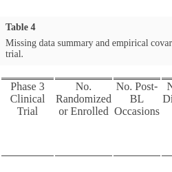 Phase 3 Clinical Trial No. Randomized or Enrolled No. Post-BL Occasions No. Patients Discontinuing Early Percent of BL and Post-BL Measurement Occasions Missing Data Little’s MCAR Testd Empirical Covariance Matrixe Changes from Baseline