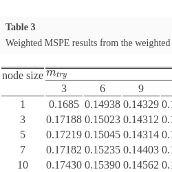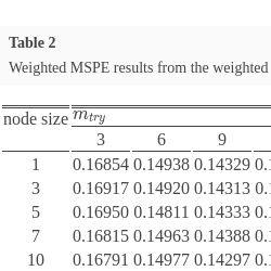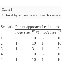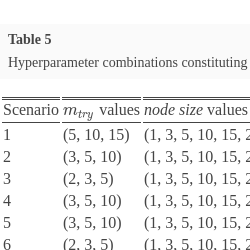 The random forest algorithm is governed by three user selected hyperparameters: M which is the number of trees in the forest, ${m_{try}}$ which is the number of randomly selected features used to split each node, and node size which is the minimum size of nodes required for further splitting. The model complexity is primarily determined by ${m_{try}}$ and node size. The recommended values for these hyperparameters in the regression framework are M = 500, ${m_{try}}=\frac{p}{3}$, node size = 5. In particular these are the default values implemented in the RF statistical package, randomForest in R software.