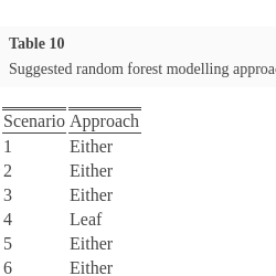 An overview of the regression framework utilized in this paper is now discussed. Let the available dataset be denoted by $T=\{{T_{n}},{T_{\kappa }}\}$, such that $T=\{({\mathbf{x}_{1}},{y_{1}}),\dots ,({\mathbf{x}_{n+\kappa }},{y_{n+\kappa }})\}$. The portion of the sample T used for model testing and tuning of the random forest (RF) model is denoted as ${T_{\kappa }}=\{({\mathbf{x}_{n+1}},{y_{n+1}}),\dots ,({\mathbf{x}_{n+\kappa }},{y_{n+\kappa }})\}$ and is of size κ. The remaining sample ${T_{n}}$ is the proportion of the data used to train the RF model. The training sample is denoted as ${T_{n}}=\{({\mathbf{x}_{1}},{y_{1}}),\dots ,({\mathbf{x}_{n}},{y_{n}})\}$ and is of size n. The input covariates are $\{{\mathbf{x}_{1}},\dots ,{\mathbf{x}_{n+\kappa }}\}$, and each is a vector of size p assumed to lie in ${\mathrm{\Re }^{p}}$. The continuous dependent variable $y=\{{y_{1}},\dots ,{y_{n+\kappa }}\}$ are assumed to be generated by a model ${y_{i}}=f({\mathbf{x}_{i}})+{\epsilon _{i}}$, $i=1,\dots ,n+\kappa $. The random errors ${\epsilon _{i}}$, $i=1,\dots ,n+\kappa $ are assumed to be independent and identically distributed random variables with mean zero, $E({\epsilon _{i}})=0$, and constant variance, $Var({\epsilon _{i}})={\sigma ^{2}}$, $i=1,\dots ,n+\kappa $. [2, pg. 2502] showed that when the function $f=E[Y|X=x]$ is almost everywhere continuous in x the random forest estimator is consistent. The aim of the RF algorithm is to estimate the unknown mean function f for a new observation having covariate vector ${\mathbf{x}_{0}}$, specifically $f({\mathbf{x}_{0}})=E[Y|\mathbf{X}={\mathbf{x}_{0}}]$. For a detailed overview of the RF modelling technique see [3].
