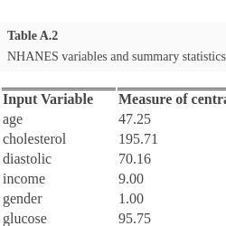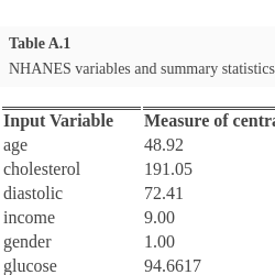 Clearly, predicted glycohemoglobin tend to range over a shorter interval than the observations they estimate, a common result when applying random forest models. This is due to the fact that the random forest algorithm estimates extreme values by the average outcomes, which are closer to the mean response f. As a result, large values of the mean function f tend to be underestimated while small values of f tend to be overestimated. To further examine model fit we provide the residual plot in Figure A.2.