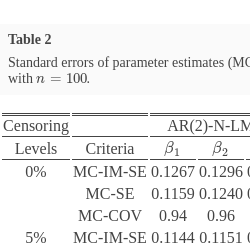We generated $R=100$ datasets from the AR(2)-t-LMEC model, considering each one of the combinations, of different sample sizes $n\in \{50,100,200,400,600\}$ and censoring levels $l\% \in \{0\% ,5\% ,20\% ,40\% \}$. In each combination, were fitted the AR(2)-t-LMEC and AR(2)-N-LMEC models. Thus, for both models, we computed the bias ($Bias$) and mean squared error ($MSE$) of the estimates obtained. These measures are defined by: