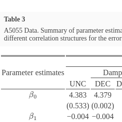 A5055 Data. Summary of parameter estimates and the standard errors of fixed effects (in parentheses)under the t-LMEC model, with different correlation structures for the errors.