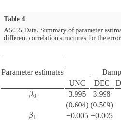 \[ {\mathbf{R}_{i}}={\mathbf{R}_{i}}(\boldsymbol{\phi },{\mathbf{t}_{i}})=\big[{\phi _{1}^{|{t_{ij}}-{t_{ik}}{|^{{\phi _{2}}}}}}\big],\hspace{0.1667em}\hspace{0.1667em}\hspace{0.1667em}\hspace{0.1667em}0\le {\phi _{1}}\lt 1,\hspace{0.1667em}\hspace{0.1667em}{\phi _{2}}\ge 0,\]The model presented in Eqs. (3.1)–(3.3) considering ${\boldsymbol{\Omega }_{i}}={\sigma ^{2}}{\mathbf{R}_{i}}$, where ${\mathbf{R}_{i}}$ is given by Eq. (3.5), $i=1,\dots ,n$, will be denoted DEC-t-LMEC.-