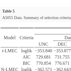 A5055 Data. Summary of selection criteria for the t-LMEC and N-LMEC model under different correlation structures.