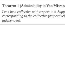 Von Mises introduced the “law of excluded gambling strategy” with the goal to define randomness of a collective [107, p. 8]. A collective is called random with respect to $\mathcal{S}$. Consequently, Von Mises integrated randomness and probability into one theory. In fact, admissibility of selection rules is equivalent to statistical independence in the sense of Von Mises. But it is defined with respect to collectives instead of selection rules.