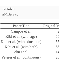 We will thus focus on examining the remaining four papers using the methodology described above. For papers Campos et al. and the model for male patients in Zhu et al., we identified 3 and 4 additional variables that improve the model, respectively. For the model for female patients in Zhu et al., the backward stepwise regression process produced a subset of the original variables chosen by the authors, so we do not investigate this model further.