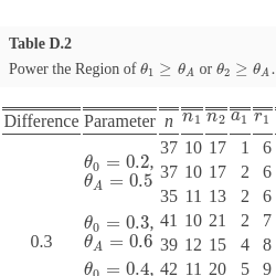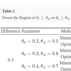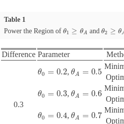 Tables 1 shows the results of the optimal and minimax design when powering at ${\theta _{1}}={\theta _{A}}$ and ${\theta _{2}}={\theta _{A}}$, the same targeting anti-tumor activities for both doses, with relative treatment differences ${\theta _{A}}-{\theta _{0}}$ of either 0.3 or 0.2. Table 1 includes the total sample size, n, the sample size of the first stage ${n_{1}}$, the sample size of the second stage ${n_{2}}$, the termination rules ${a_{1}}$ and ${r_{1}}$ for responses, as well as the total responses for claiming efficacy from Stage II, r, the probability of early termination ${\text{PET}_{Avg}}$ at Stage I, and the expected sample size ${\text{EN}_{Avg}}$. The study designs presented in Table 1 power the alternative points at the minimum of 80% and control the type I error at the level of 1-sided 0.05.