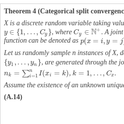 Our theoretical study demonstrates that split convergence can be guaranteed under three assumptions: (1) the existence of unique optimal split; (2) the uniform random sampling of pseudo-data ${D^{\prime }}=\{{Y^{\prime }},{X^{\prime }}\}$; and (3) the greedy search algorithm. Since continuous and categorical response variables have different split criteria for regression and classification, and different types of covariates require distinct treatments in the proof, we divide the theory into four theorems, each corresponding to one of the combinations of variable types listed in Table 1. The details of all theorems, lemma, and their proofs can be found in Appendix A.