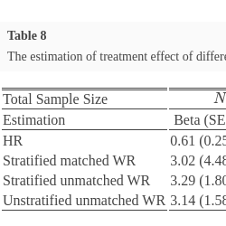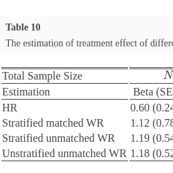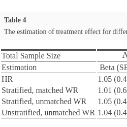 (Stratified) Matched Win Ratio  We stratify patients into different strata based on their baseline covariates, and then form matched pairs on the study drug and the control. For each matched pair, according to the following criteria, we then compare each patient in the study drug group with the one matched in the placebo group is a winner or a loser and its asymptotic properties via Algorithm 1 [15]. We also note that [12] proposed a closed-form variance estimator and approximate $1-\alpha $ confidence interval, which could be utilized for testing the null hypothesis.