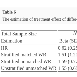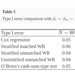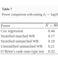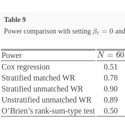 In this section, we show the winning rules of matched and unmatched methods for the composite endpoint of two prioritized survival components. To further explore the pros and cons of the WR methods, traditional Cox regression in survival analysis and O’Brien’s rank-sum-type test are considered and incorporated [2]. Point estimation and its corresponding confidence interval and power comparison are extensively explored via numerical studies in Section 6.2.