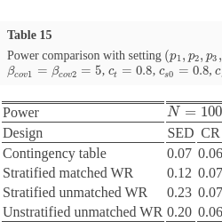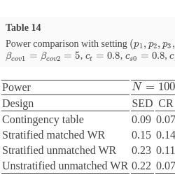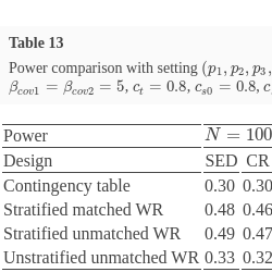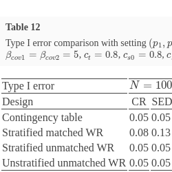 To demonstrate the pros and cons of the WR methods, we consider different winning criteria, and results are illustrated by comparing WR methods with those via O’Brien’s rank-sum-type test and the contingency table. We follow Section 5 to generate different types of data. Section 6 shows our simulation results and findings. Besides examining the WR methods mainly applied in the single parallel design, covariates stratification and innovative designs such as two-stage designs, including sequential parallel comparison designs and sequential enriched design, are used to provide further efficiency [4, 20, 22].