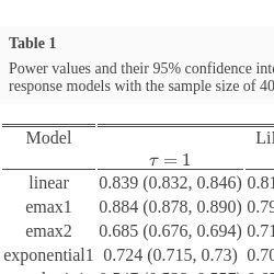 As illustrated in Figure 2, we find that LiMAP-curvature has better performance when the true dose-response relationship exhibits low curvature, e.g. linear, emax1, logistic1, logistic2 and sigEmax, achieving over 80% power at a type I error rate of 5%. Choosing an appropriate τ can further improve the performance of LiMAP-curvature. More specifically, LiMAP-curvature achieves better performance with a larger τ for the true dose-response curve that is more curved, e.g. quadratic1 and beta models. Otherwise, e.g. in logistic1 and power models, a smaller τ performs better. How to select an appropriate τ in practice will be discussed in Section 4.